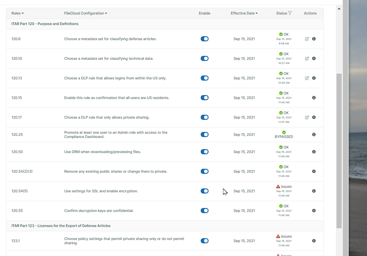For many rules, you must navigate to other pages in FileCloud and configure settings. The compliance tool will verify that the settings are configured correctly when you enable the rule.