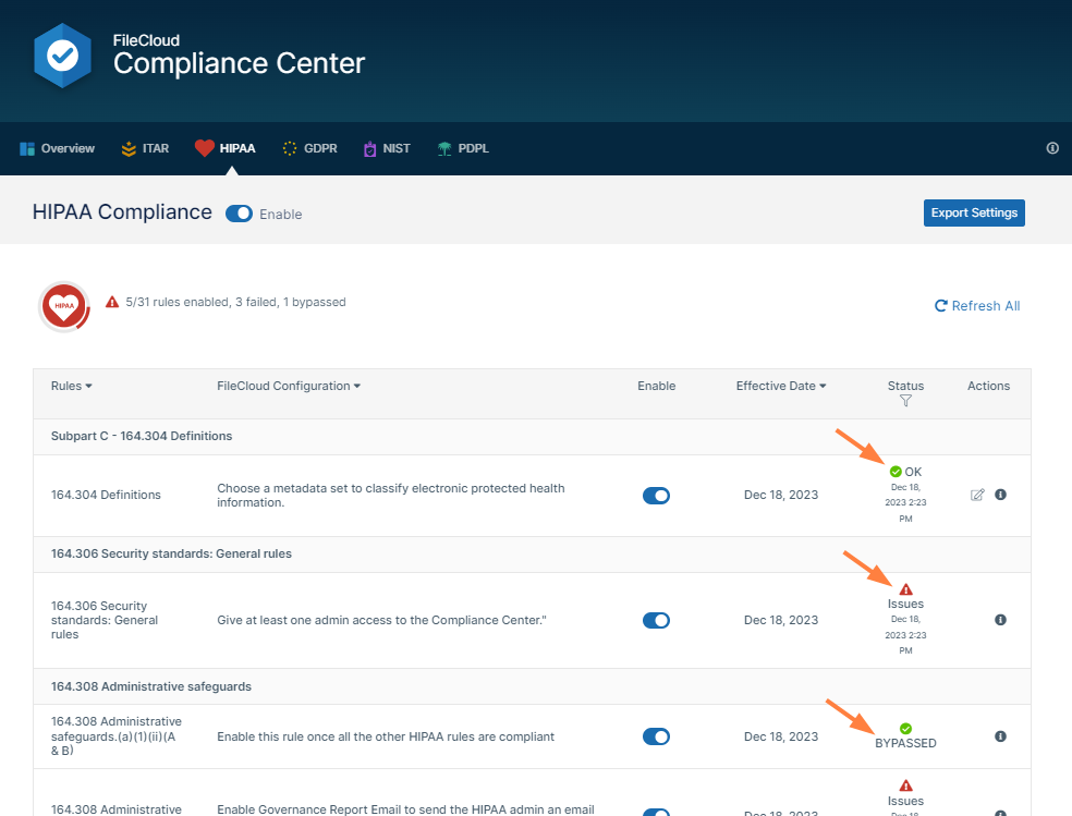 For more details about the rules covered for each compliance and how they are handled in FileCloud, see: