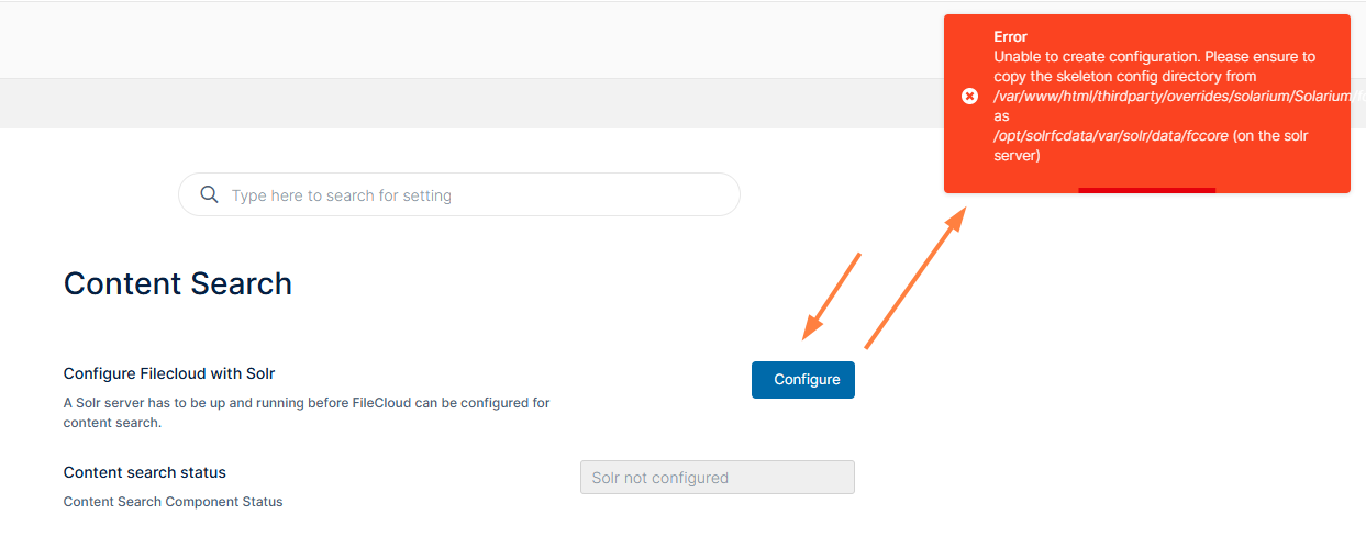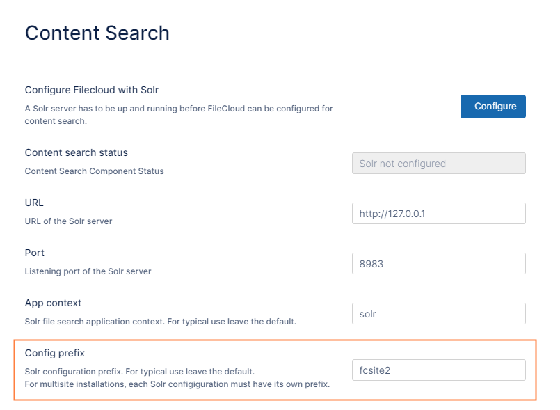 - Configure FileCloud with the URL of the Solr server and the port number.