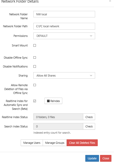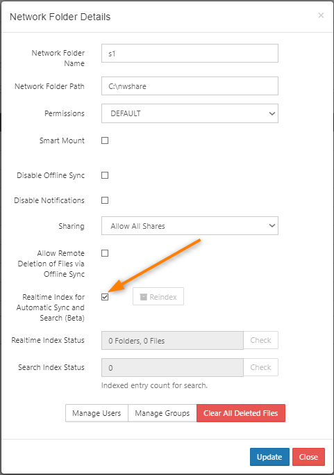 - In the share settings dialog, select the check box labeled Realtime Index for Automatic Sync and Search (Beta)