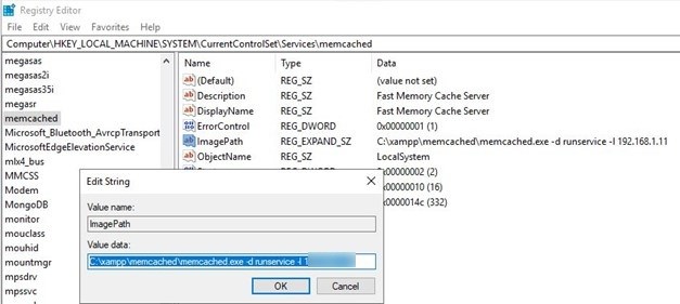 Computer\HKEY_LOCAL_MACHINE\SYSTEM\CurrentControlSet\Services\memcached - To change the localhost binding to the private IP of the servers where Memcache is running, in Value data, enter the following, replacing 192.0.2.0 with your server's IP address: