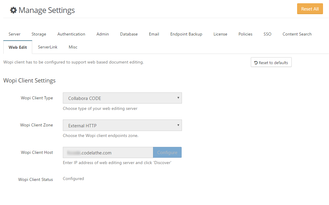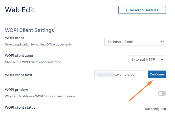 Fill in the following values for the first three settings: WOPI client: Collabora CODE WOPI client zone: External HTTP WOPI client host: IP address/URL of office online server used as WOPI client host.