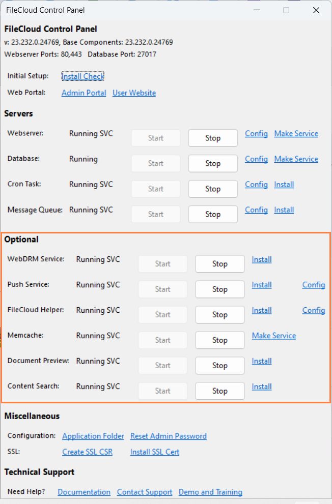 Because these components are optional, they can be added or removed at any time from the FileCloud Control Panel.