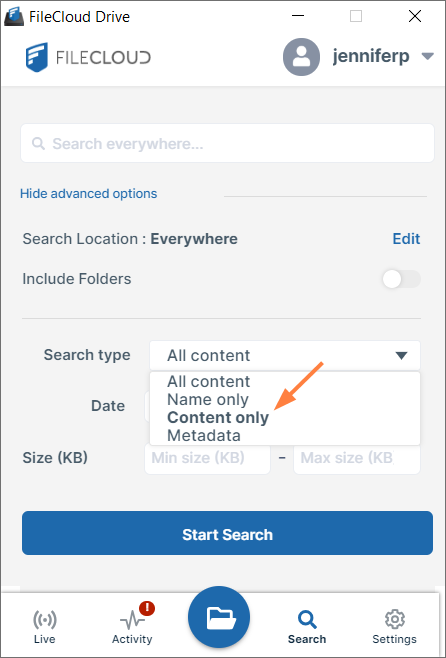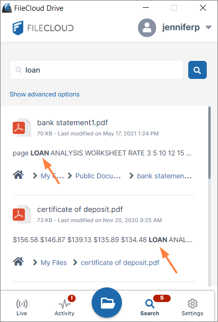 Note that your admin must have configured content search in FileCloud for content searches to work.