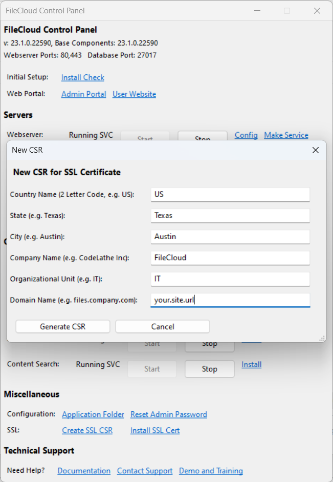 Create a CSR in the FileCloud Control Panel