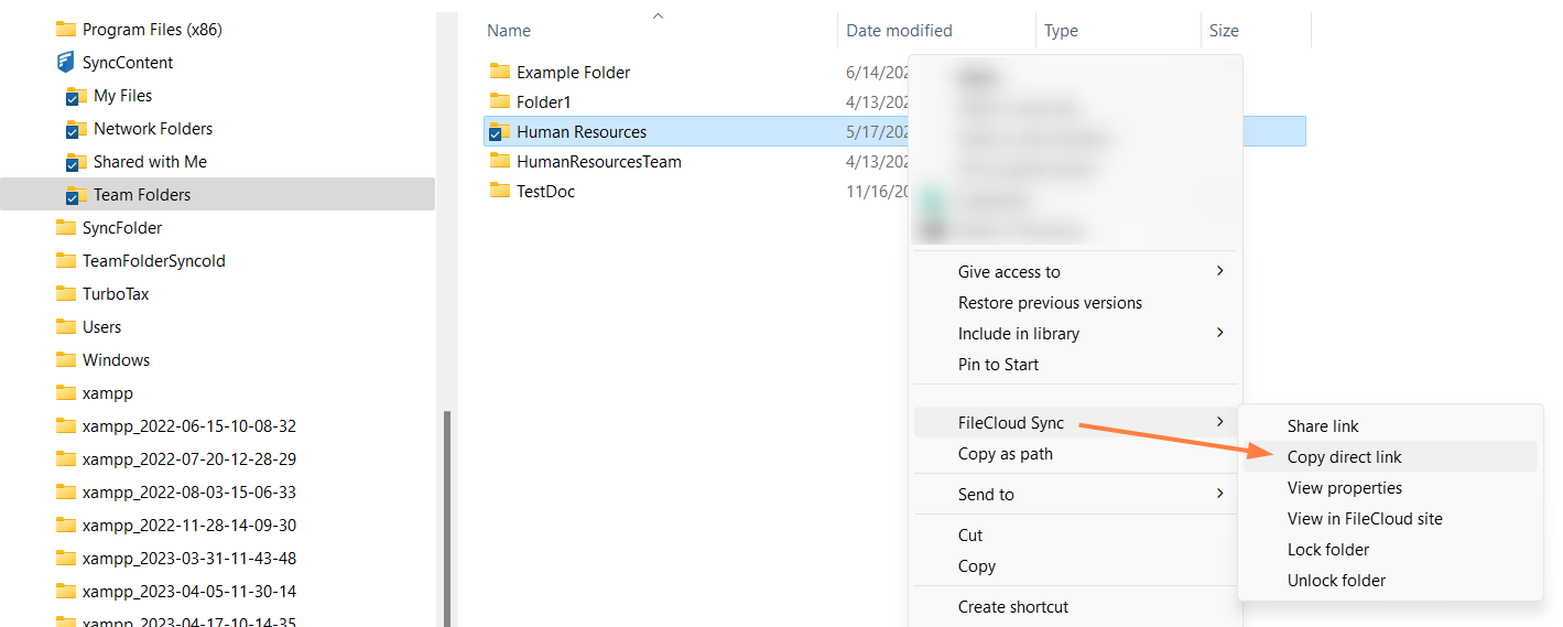 4. Navigate to the item, then right-click it and choose Show More Options. In the next menu choose FileCloud Sync > Create Direct FileCloud Link.