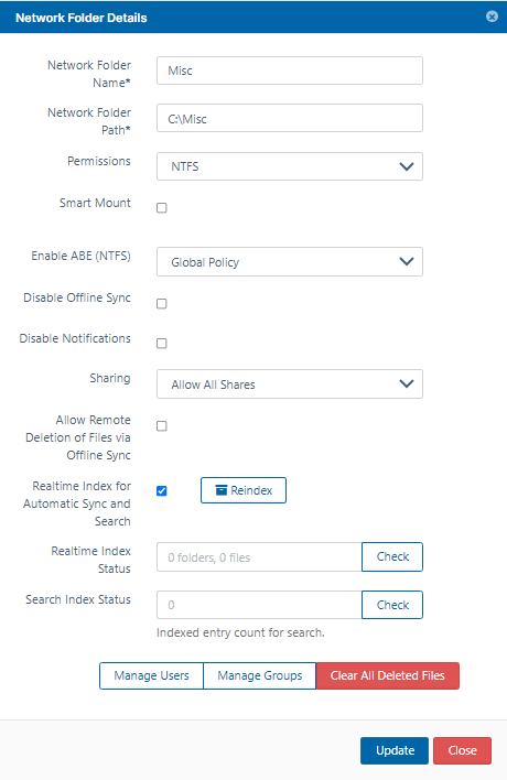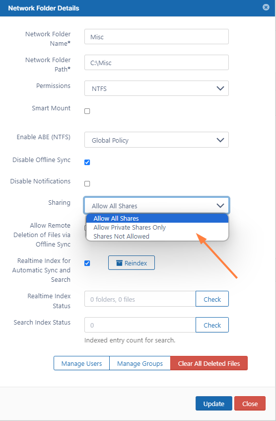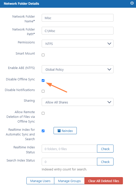 This setting controls whether or not a network share location can be synced by a user using sync client for offline access. You can disable offline sync for individual network folders as well. See Sync Network Folders for Offline Access for more information about syncing network folders.