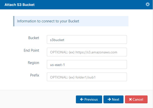 - On the Attach S3 Bucket window, type in the Bucket name, Region, and optionally the End Point and Prefix.