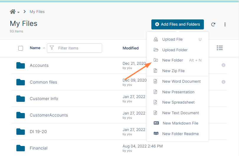 For help using the markdown editor, see Using the Markdown Editor. - Click Save, and click the arrow in the upper-left of the markdown editor to return to the list of folder contents.