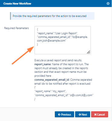 Specify the report name created previously and the emails of the users who will receive the report in the format given in the template.