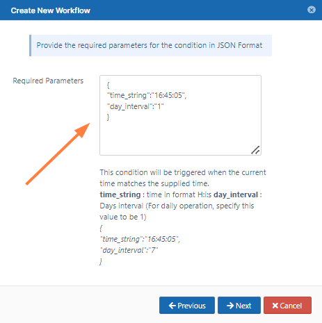 Specify the time in the format given in the template. Specify the day interval as 1 to indicate that the workflow should be triggered daily.
