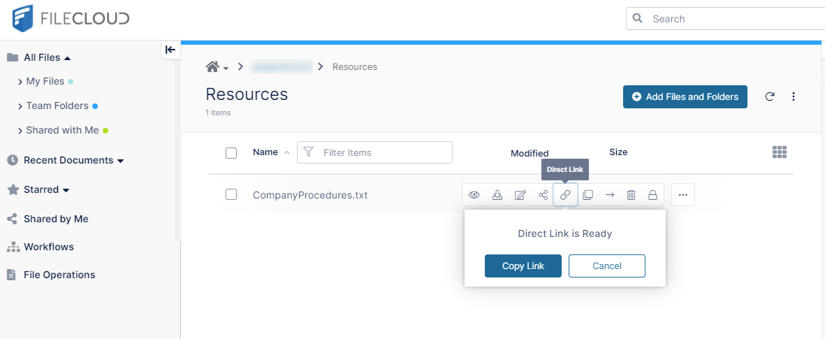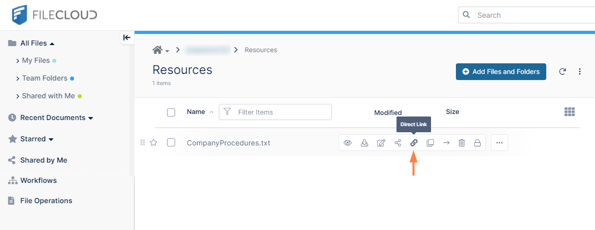 - Hover over the file or folder and click the Direct Link icon.