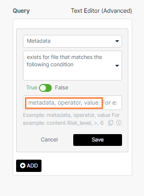 The query editor indicates the format for the final part of the query. In this case it is metadata, operator, value: