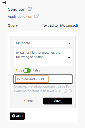 In the following example, we'll create a query that checks if an uploaded invoice file is for an amount greater than $500, and if it is, we'll send it for approval. Following the step by step procedure is a video that shows you the complete process at once.
