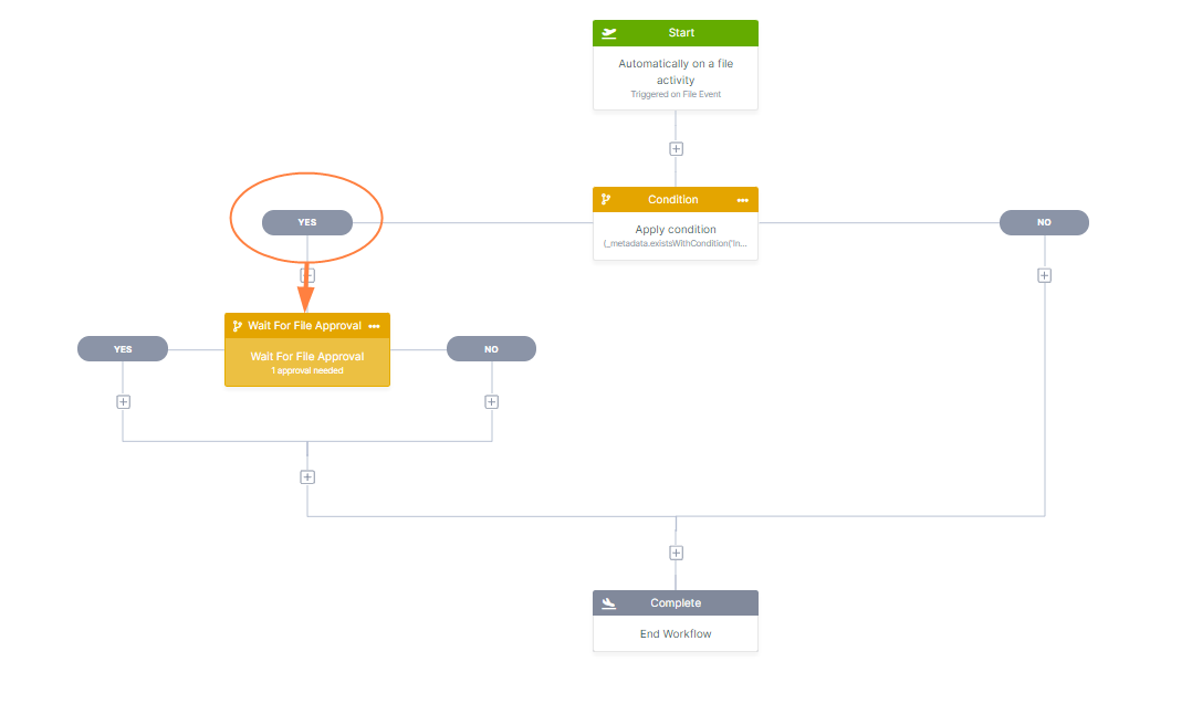 The condition is complete. Now, we can add a workflow step that occurs either when the condition is found true or when it is found false, or both.We add a step to wait for approval if the condition that the invoice amount is > 500 is true.