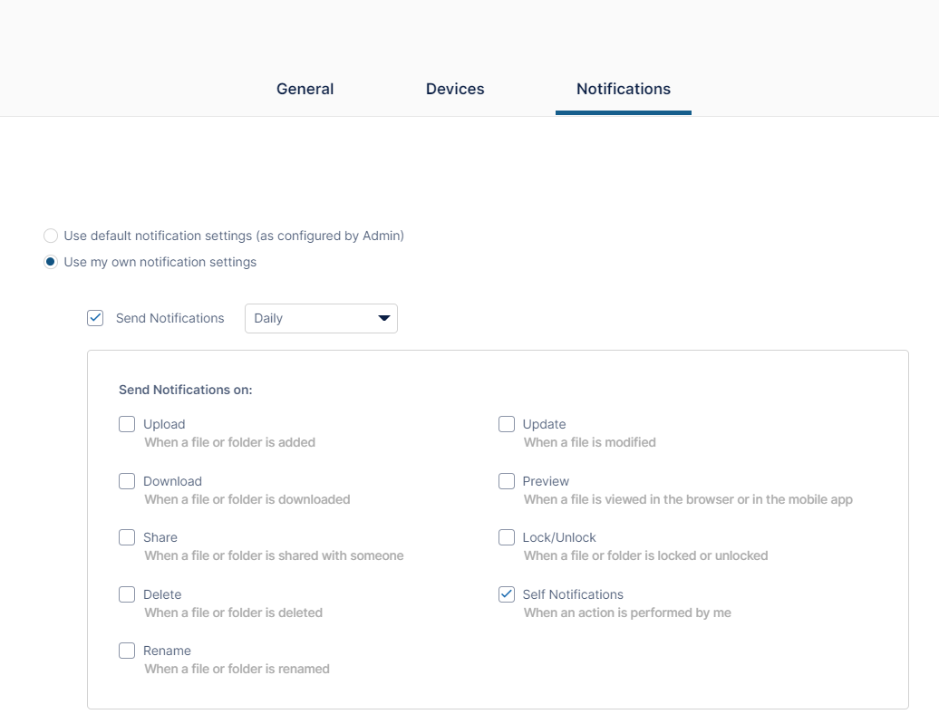 Check any actions that you want to receive notifications about.Uncheck Self Notifications if you do not want to receive notifications about changes you make to your own files or folders.
