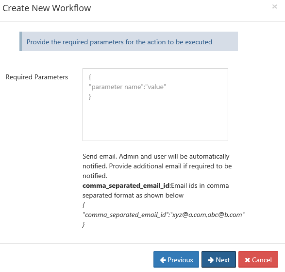 | Notify user(s) | { "comma_separated_email_id":"xyz@a.com,abc@b.com" } | Sends a notification to users matching the criteria and sends an email to the admin and the specified addresses with information about the users who were sent notifications. comma_separated_email_id - email ids in comma separated format | |