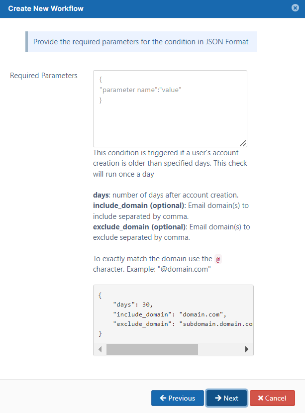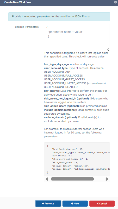 excluded_email_domains: (Available in FileCloud 21.2 and later) Email domain used to create the user. This isoptional. If the new user has any of these domains, the workflow is not triggered. If included_email_domains is set, this parameter is ignored.