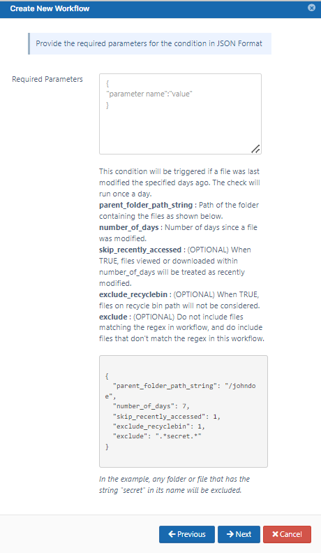 For example, if you specify the number of days as 15, all files in the specified folder that have not been modified in the last 15 days will subject to the the THEN action you configure.