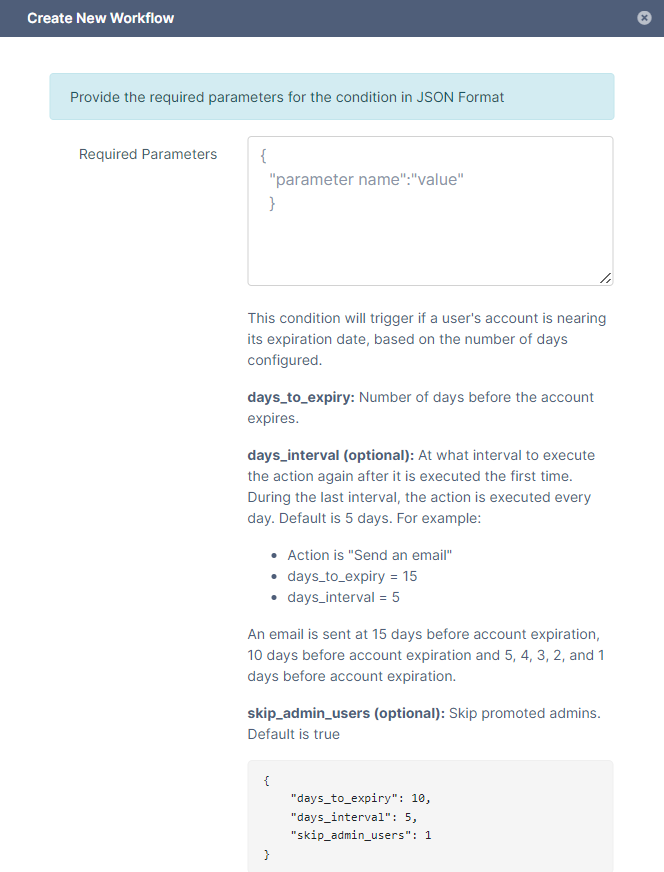 For example, When a user's account is set to expire in 15 days, perform an action such as sending the user an email. Send the email again every 5 days, but the last 5 days, send the email every day. Do not perform the action on promoted admins.