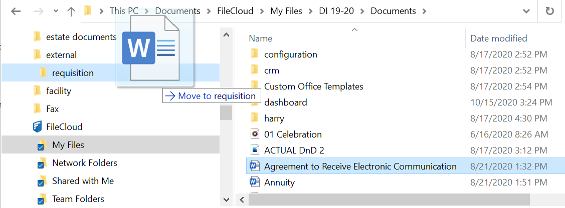 In the example below, the file Agreement to Receive Electronic Communication is moved from a sub-folder in the Sync My Files folder to the external folder Requisition.