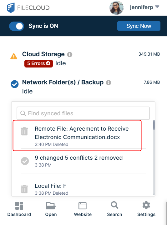 When syncing occurs, the Agreement to Receive Electronic Communication file is logged as a deletion: