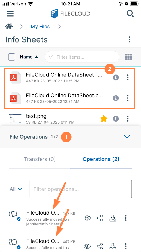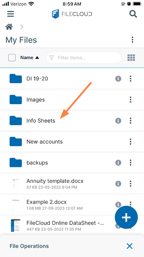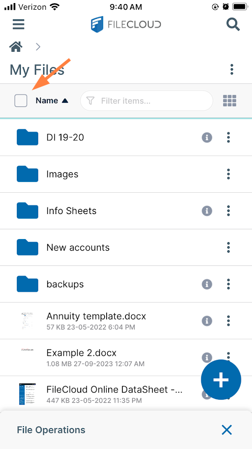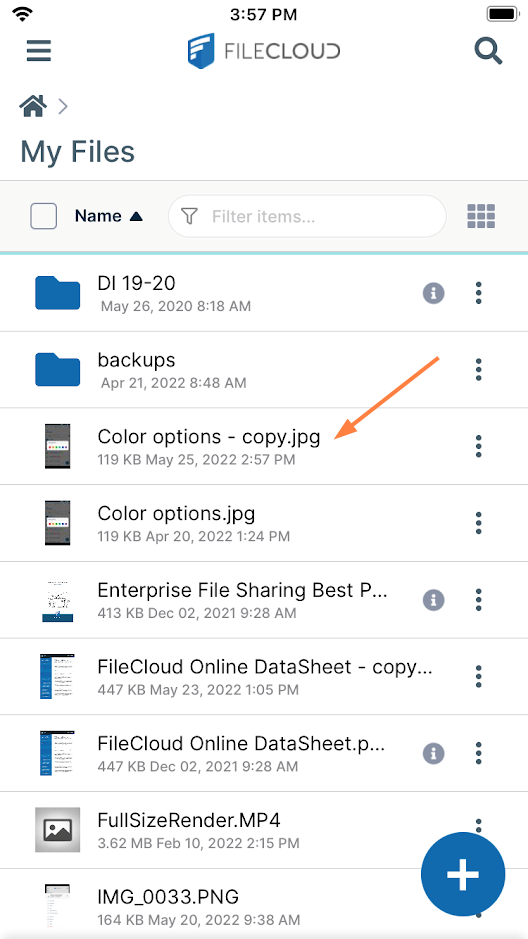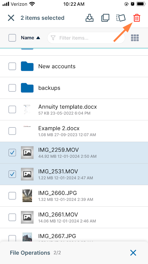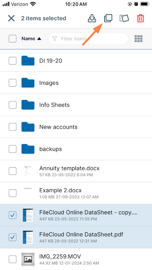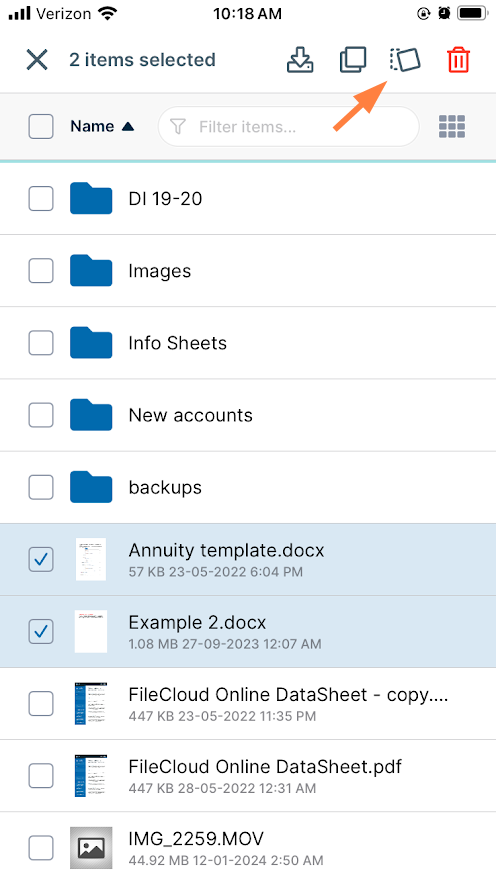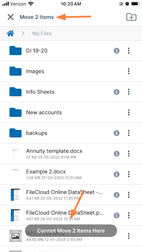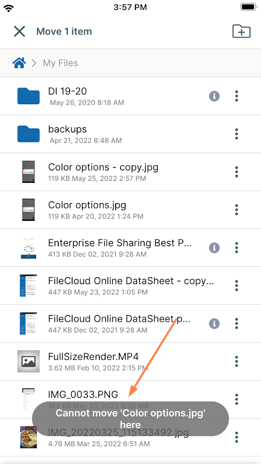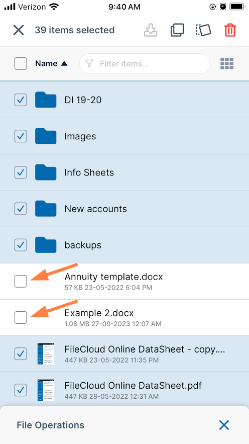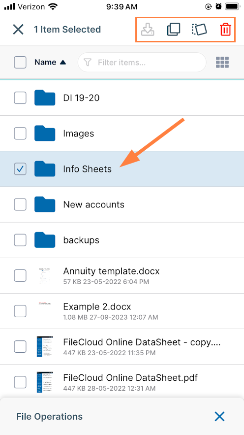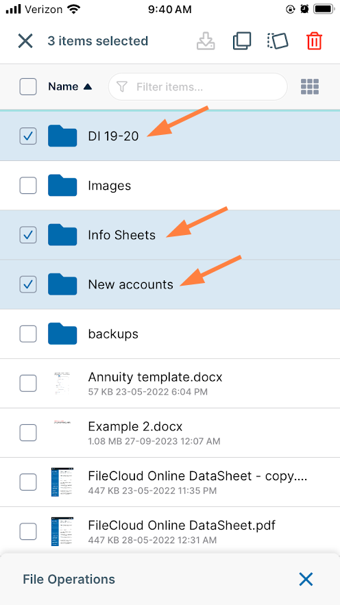 In the FileCloud iOS app, you can delete, move, copy, and rename your files and folders. You can perform the delete, move, and copy operations on a single file or folder or on multiple files and folders at the same time, but you can only rename one file or folder at a time.