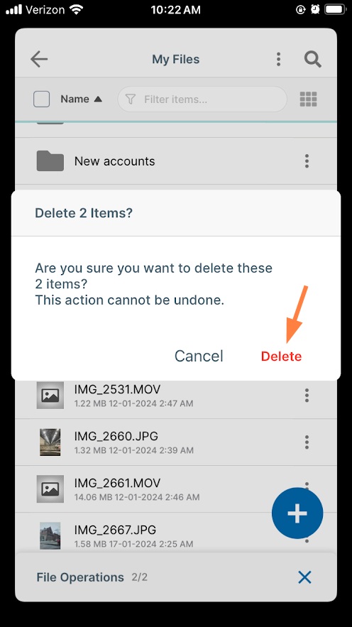 Access the file or folder actions and tap Delete. You are prompted to confirm deletion.
