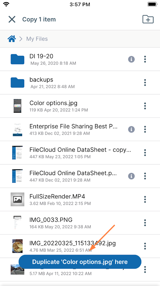 If you want to copy the item into the same location, tap the Duplicate here message. If you want to copy the item into another location, navigate to the location, and then tap the Duplicate here message. A copy of the file or folder is created in the location.