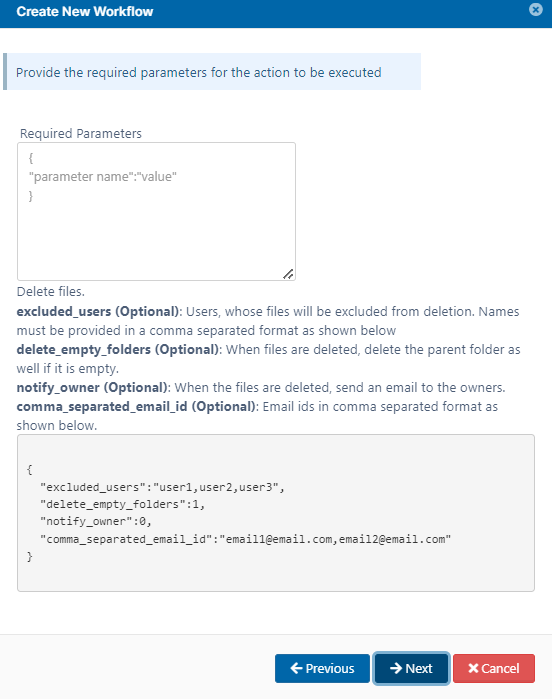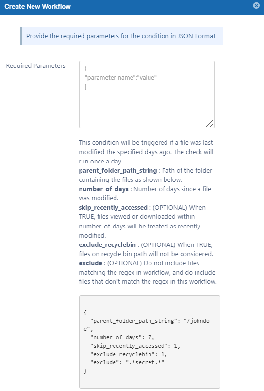CODE{ "parent_folder_path_string": "/johndoe", "number_of_days": 7, "skip_recently_accessed": 1, "exclude_recyclebin": 1, "exclude": ".*secret.*" }Note - This workflow only applies to Managed Storage and not to Network Folders.