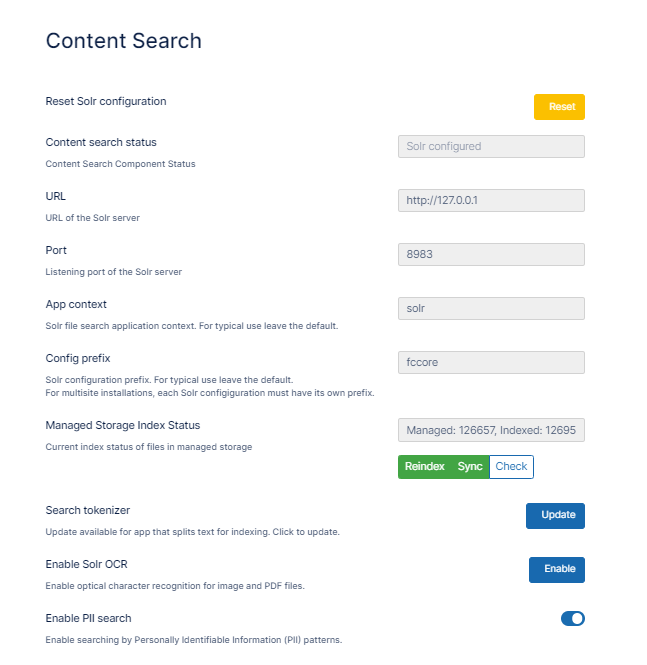 In the FileCloud admin portal's left navigation bar, scroll down and clickSettings.Then, on theSettings navigation page, clickContent Search. The Content Search page opens.