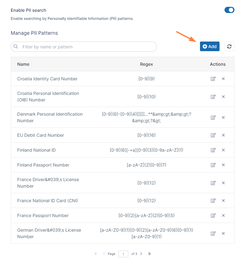 Click Add to add a PII patten for your confidential Information. Enter the new PII search pattern, and set Regex to the confidential statement to detect inside your documents, for example, "(This is a confidential document, For internal use only)". Note that statement should be inside (). If you have multiple statements to detect in your document you can use (statement1) | (statement2 ) | (statement3) . In this example, you are also adding the pre-defined patterns with personally identifiable information listed below.