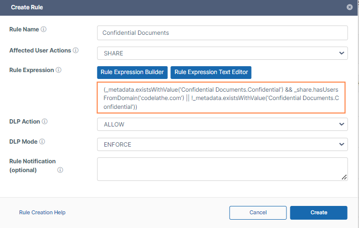 For documents that are confidential, the rule checks for metadata attribute "Confidential" = "Yes" and allows sharing with only domain "codelathe.com".