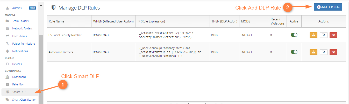 Log in to the FileCloud Admin portal. In the navigation panel, click Smart DLP.