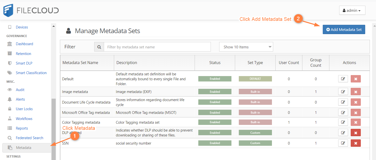 Log in to the FileCloud Admin portal, and in the navigation panel, click Metadata, then click Add Metadata Set.