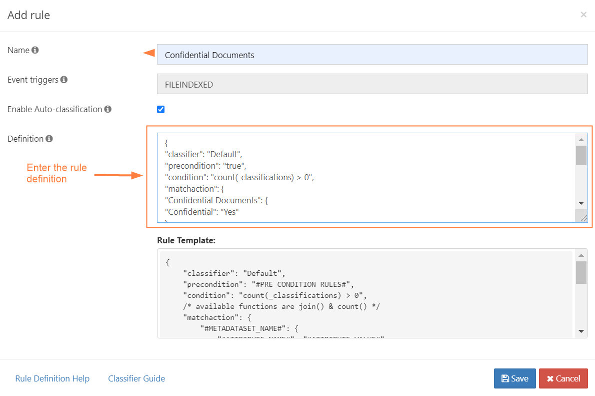 Make sure to specify the exact name of the metadata along with attribute name and PII Regex pattern. In the Add Rule dialog box, enter the following into Definition: