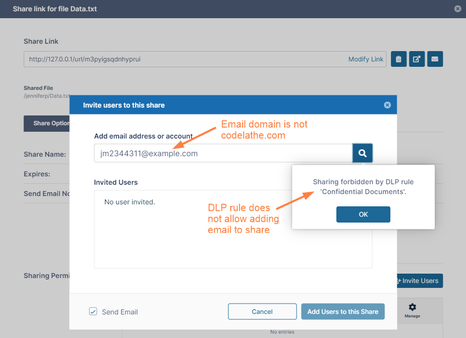 Confirm that sharing is only allowed with users from the domain "codelathe.com".