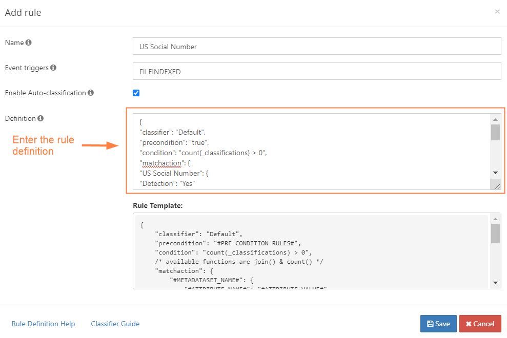Make sure to specify the exact name of the metadata along with attribute name and PII Regex pattern. In the Add Rule dialog box, enter the following into Definition: