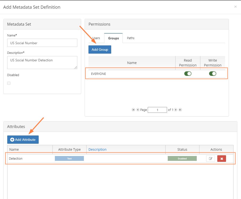 - Create a metadata set with the attribute Detection of type text.