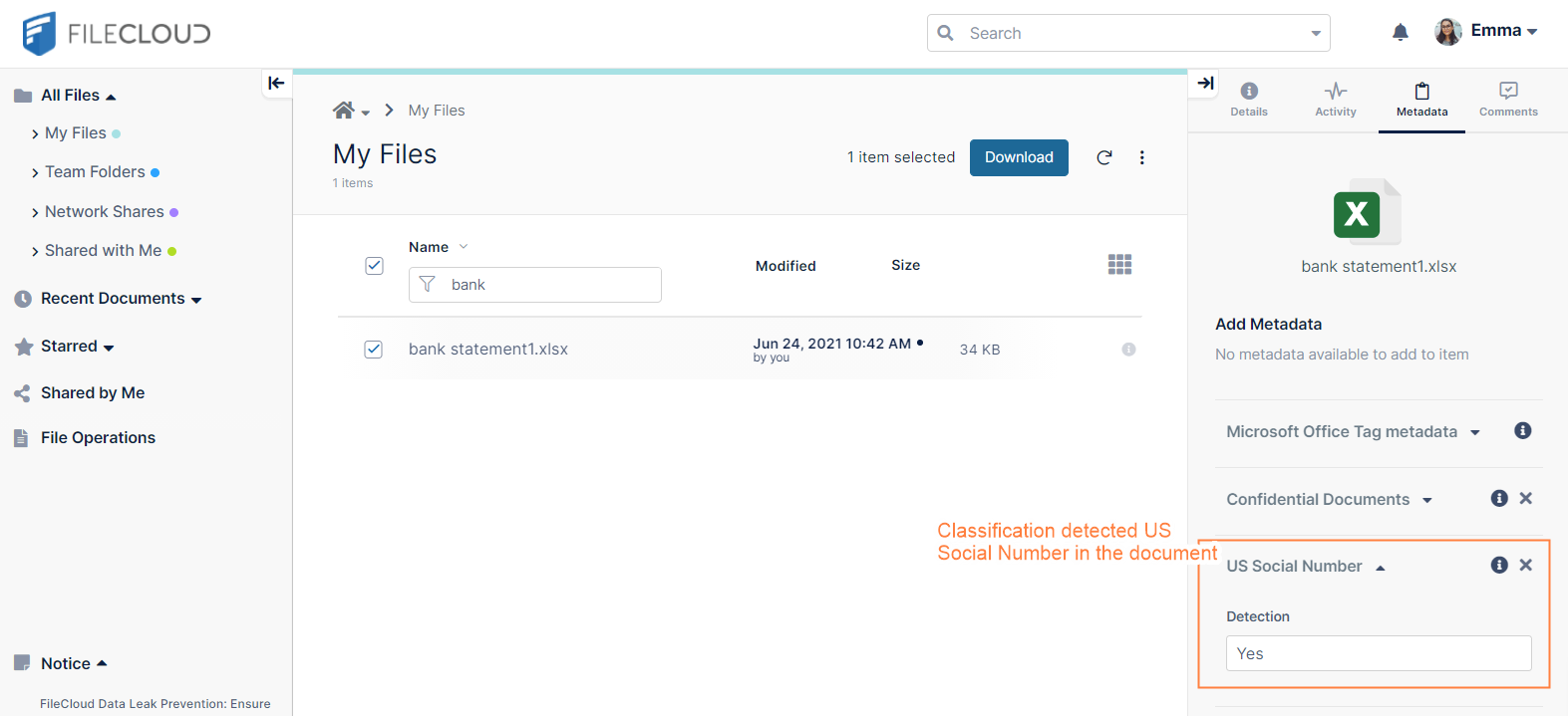 - Upload multiple documents to My Files or to a Team Folder. Some of the files should contain US Social Number examples.