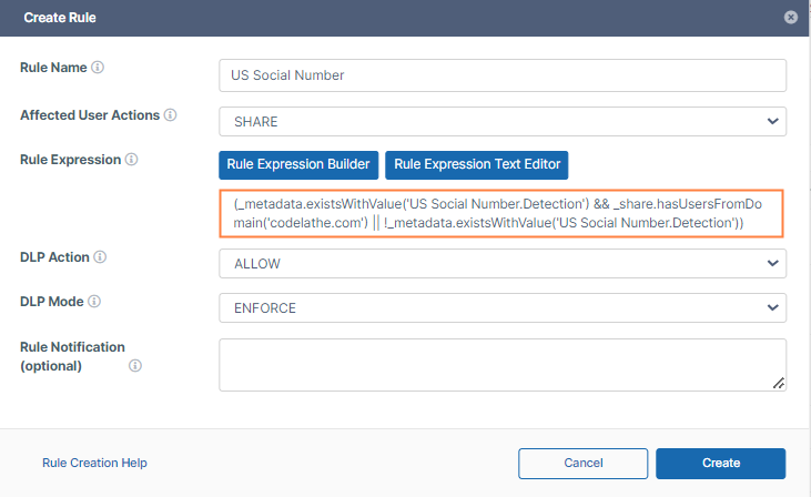 - For Documents that contain US Social Number, the rule will check for metadata attributes "Detection" = "Yes" and allow sharing with only domain "codelathe.com"