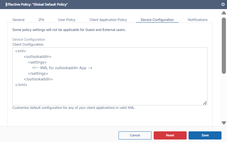 To set FileCloud's Outlook add-in device configuration for a policy: