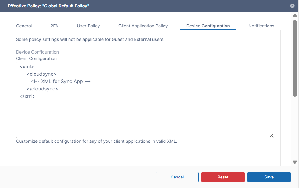 Client Device configuration settings can be configured remotely by specifying the configuration XML using policies.