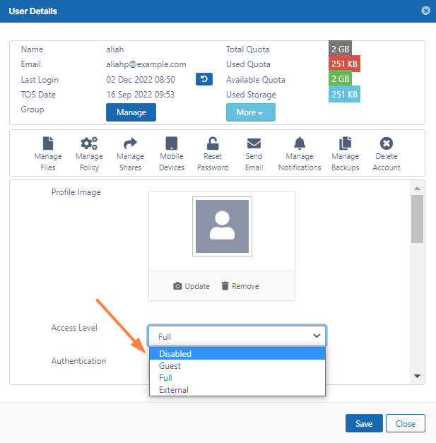 If there are users with disabled accounts in the AD group, they are listed in the admin portal's Manage Users screen with Disabled Access.