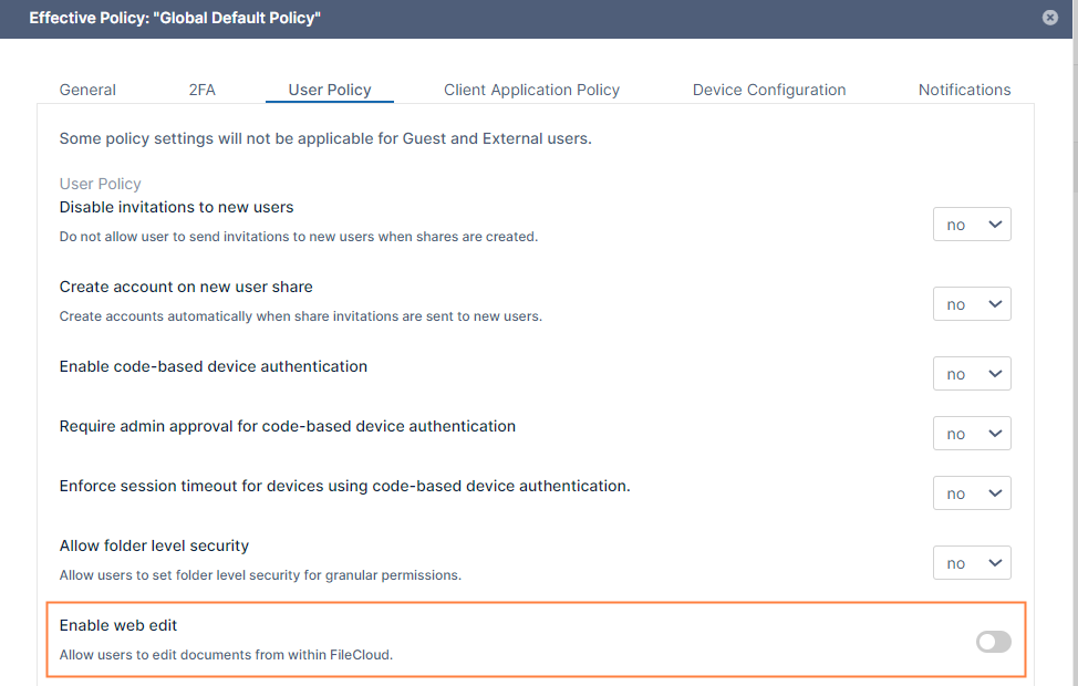 In the FileCloud admin portal's left navigation bar, scroll down and clickSettings.Then, on theSettingsnavigation page, clickPolicies . The Policies settings page opens.