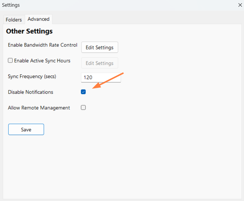 - On the Settings window, on the Advanced tab, select the Disable Notifications checkbox.