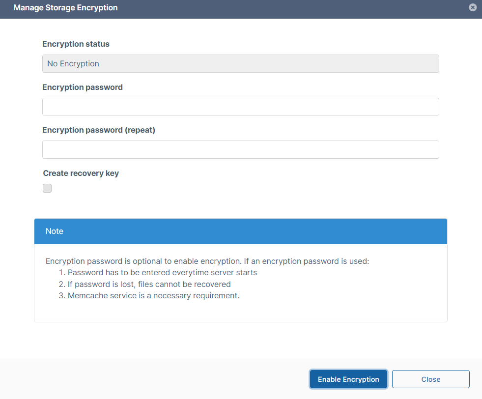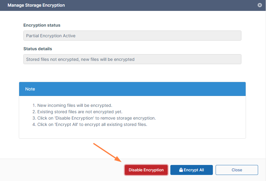 - Now all the stored files are decrypted, but new files will continue to be encrypted. To disable encryption completely, click Disable Encryption.