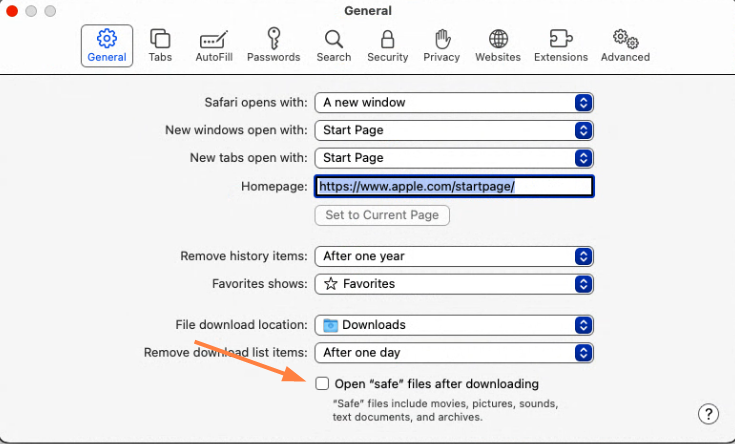 The Settings dialog box opens to the General tab. - On the General tab, uncheck Open "safe" files after downloading.