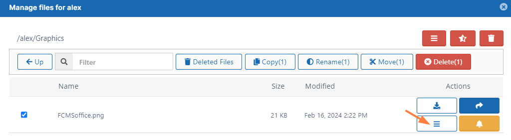 The Manage Files for <User> window opens. - Navigate to the folder or file you want to download.