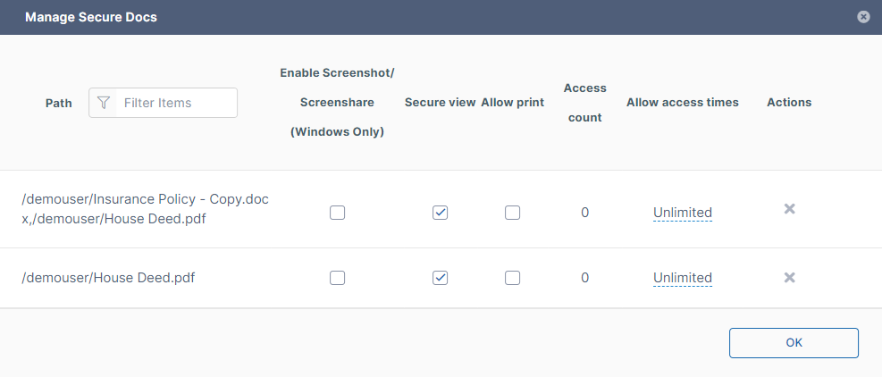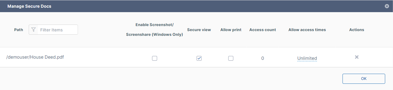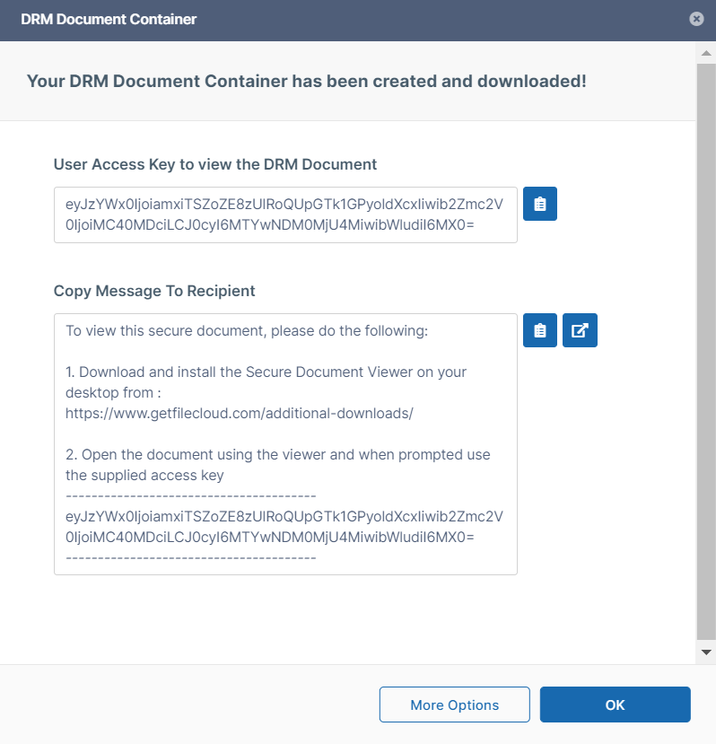 By default only Enable Secure View is checked. Check or change any of the options and click OK.Option Description Enable Screenshot/Screenshare (Windows only) Allows Windows users to take screenshots of the file and to share their screen when the file's contents are displayed. Secure view Allows users to view the file through the secure viewer. Allow print Allows users to print the file. Access count Keeps a tally of how many times the file has been accessed. Allow access times Limits the number of times the file can be accessed to this number. Actions X removes users' ability to view or otherwise access the file. Copy the message from the DRM Document Container window.